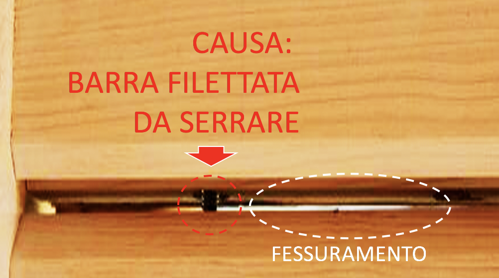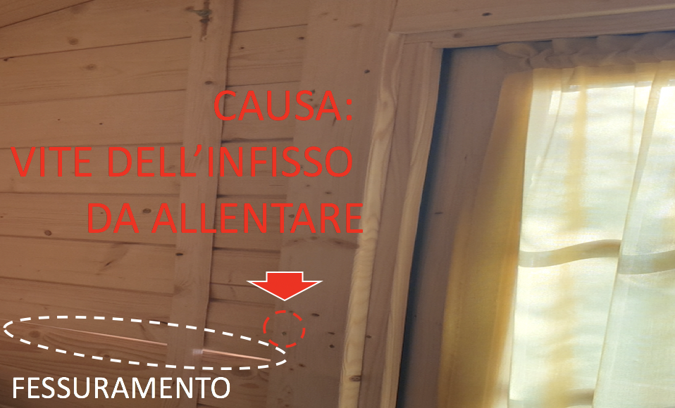 - Verificare le viti degli infissi (le cornici in legno perimetrali ad ogni porta e finestra) per assicurarsi che nessuna di esse possa aver bloccato delle assi della parete rispetto il suo normale e naturale assestamento verso il basso (a volte visibili graziee a micro fessurameenti tra le assi della parete). In tal caso svitare la vite e lasciarla svitata fino al normale assestamento delle assi.