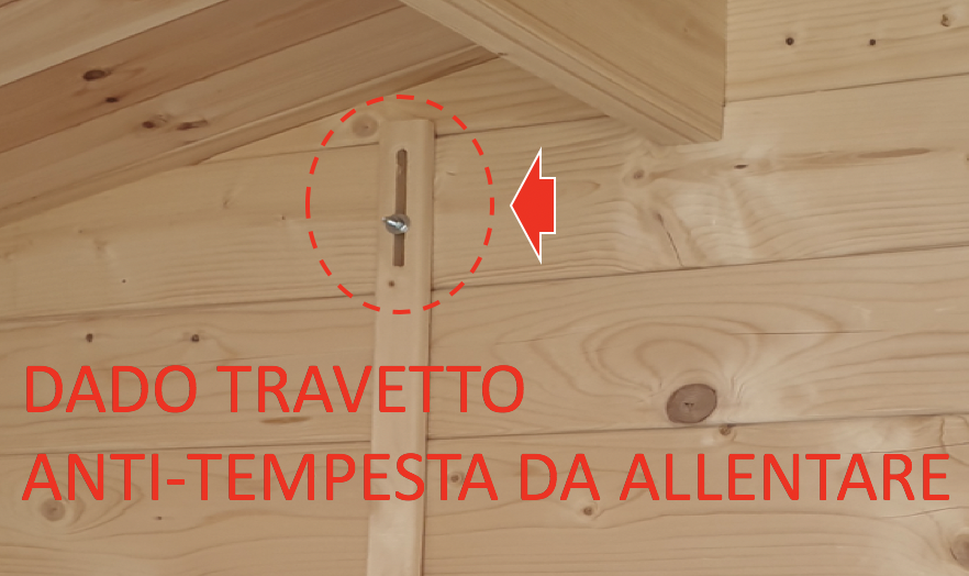 - Verificare il serraggio dei dati dei travetti anti-vento interni (generalmente posti vicino agli angoli interni) e allentare il dado dell'asola per permettere alle assi della relativa parete di assestarsi verso il basso in modo uniforme. Ogni 3 mesi (più frequente in caso di siano presenti uno dei fattori precedenti).