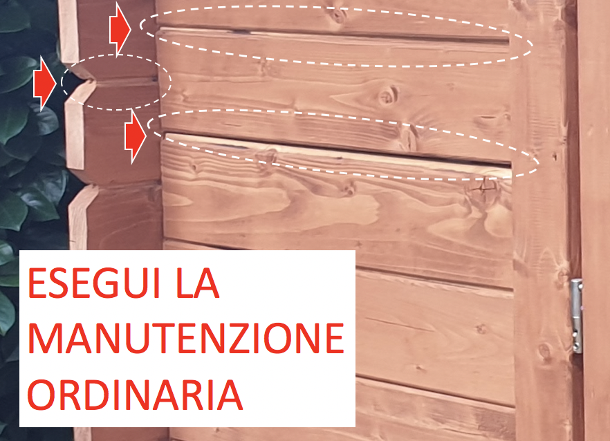 Inoltre, il normale e naturale assestamento delle assi della casetta può essere limitato anche da viti ad esse fissate che sono state poste internemente o esternamente la casetta per fissare alle pareti mobili, scaffali, mensole, impianti, ecc. Tali viti, ove presenti, devono essere verificate e nel caso temporaneamente eliminate per evitate di creare un sistema "iper-rigido" tra le assi delle pareti che, quindi, non sono più in grado di assestarsi in modo naturale sia: 1) durante i primi 12 mesi con il primo ciclo di stagioni nel sito di installazione (periodo di assestamento al sito specifico), 2) durante i successivi anni al naturale alternarsi delle stagioni. Il legno è un elemento naturale che si adatta continuamente alle caratteristiche del sito (temperatura, umidità, pressione) quindi la casetta in legno sarà in continuo adattamento.