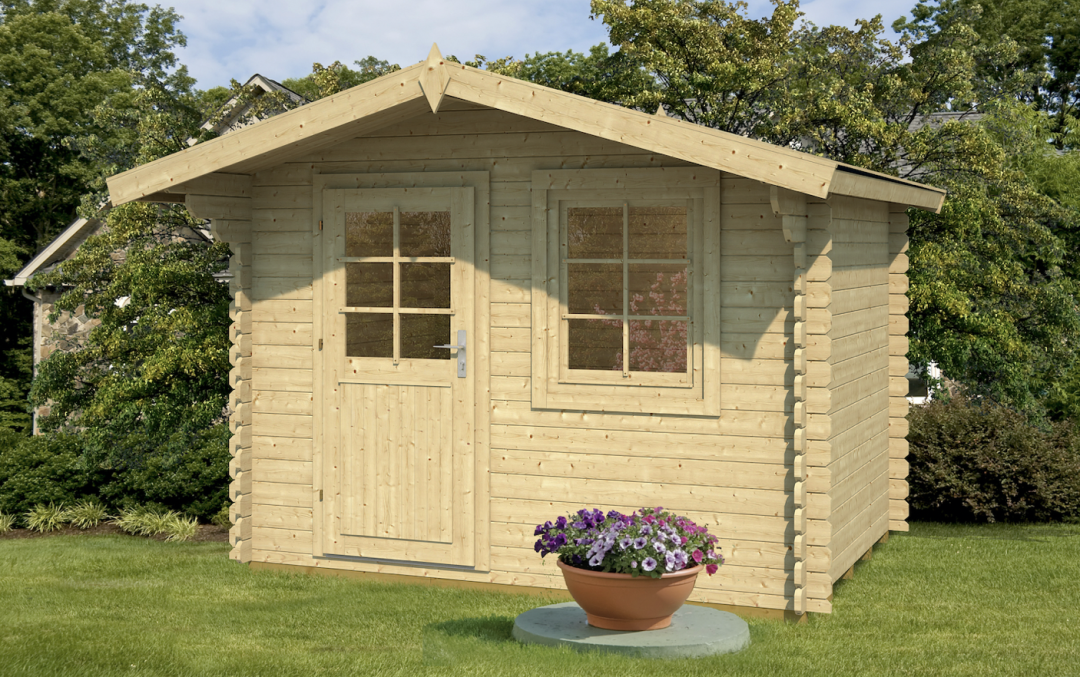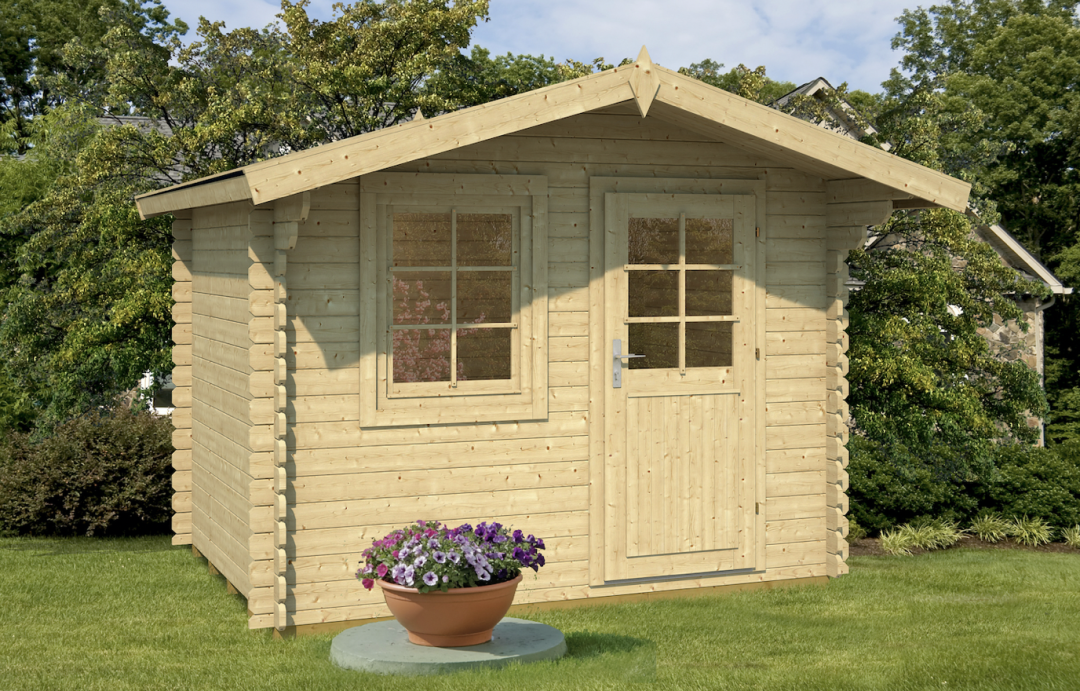 Casetta in legno  da giardino, in legno massello di abete nordico e proveniente da foreste certificate FSC (alberi a lenta crescita che garantiscono la minima presenza di nodi da ramo sulle assi, quindi la massima robustezza ed estetica nel tempo).  Linea classica con tetto a due falde e porta e finestra sul lato frontale: è possibile montare sia porta a sinistra e finestra a destra che viceversa. Può essere usata come capanno porta attrezzi o come vano aggiuntivo per immagazzinare oggetti della casa, del giardino o della piscina. La casetta in legno è dotata di porta con vetri, serrature moderne e resistenti a cilindro (tipo serratura Yale).
