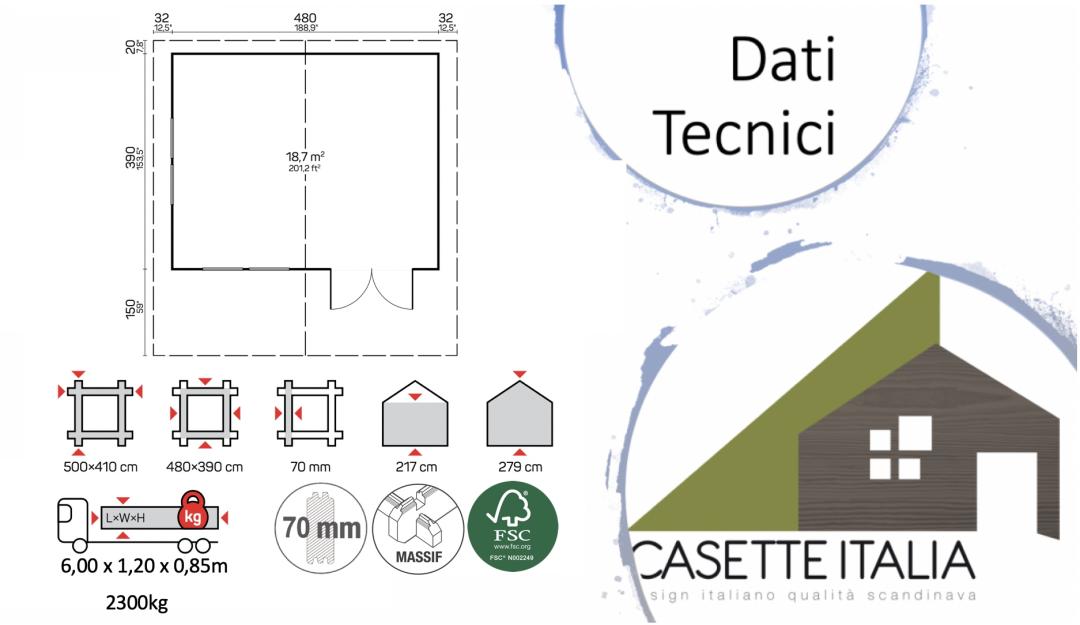 Casetta in legno da giardino in abete bianco nordico con legni della migliore qualità e rigorosamente provenienti dal nord-Europa e spessore di ben 70mm (disponibile su richiesta anche con spessore di 58mm) quindi super-robusta e con il massimo isolamento termico in tutte le stagioni. Unico vano e con il tetto doppia-falda spiovente sui due lati per proteggere chi deve entrare o uscire anche in assenza di gronda e pluviale. La forma classica è in grado di adattarsi perfettamente a ripostiglio porta oggetti da giardino come sdrai, sedie e tavoli ma anche per essere vissuta come vero e proprio vano aggiuntivo durante tutte le stagioni: studio, stanza lavanderia, sala da pranzo per passare bei momenti con amici e parenti. La casetta prefabbricata è dotata di porta semi-finestrata  e di una ottima tettoia frontale di 150cm che ben protegge da pioggia e sole con buon ombreggiamento. Sia il tetto che il pavimento sono composti da assi di spessore 18mm. Il tetto, grazie alla buona inclinazione permette un buon defluire dell'acqua piovana e della neve.