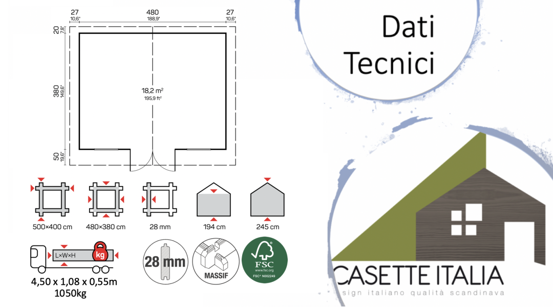 Casetta in legno  abitabile a vano unico e dalla architettura classica. La casetta prefabbricata è dotata di porta semi-finestrata e di 2 finestre frontali che affiancano la doppia porta semi-finistrata: la luce naturale all'interno è garantita! La tettoia frontale sborda per circa 50cm ed il tetto, grazie alla abbondante inclinazione permette un ottimo defluire dell'acqua piovana e della neve e possono anche essere inserite le gronde ed i pluviali a completamente della casetta. Legno massello di abete nordico e proveniente da foreste certificate FSC (alberi a lenta crescita che garantiscono la minima presenza di nodi da ramo sulle assi, quindi la massima robustezza ed estetica nel tempo).  La casetta in legno è dotata di porta con vetri, serrature moderne e resistenti a cilindro (tipo serratura Yale).