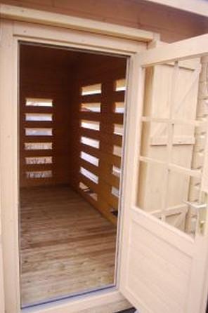 Casetta da giardino in legno massello di abete nordico con due vani separati di cui uno aperto grazie a griglia (ma realizzabile anche chiuso). Ottima casetta da adibire a cantina porta oggetti con vano aggiuntivo per biciclette, moto, scuter ed affini. Elevata resistenza strutturale di tutta la struttura ed al carico neve grazie allo spessore delle pareti. Il suo design versatile e la solidità ne consentono gli utilizzi più svariati. Sia la doppia porta che la porta singola hanno vetri solo sul quarto superiore per evitare la visione interno-esterno; inoltre è presente una soglia alluminio che permette la lunga durata della porta stessa, dotata anche di guarnizione isolante per assicurarne l’efficienza energetica. Le maniglie sono resistenti e le serrature sono a cilindro (tipo Yale).