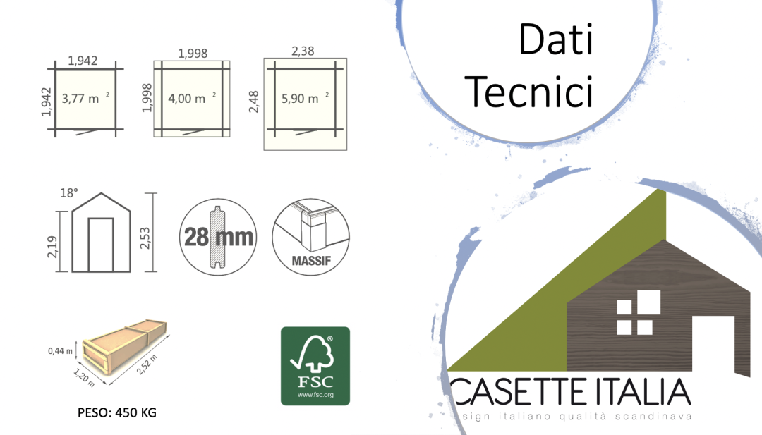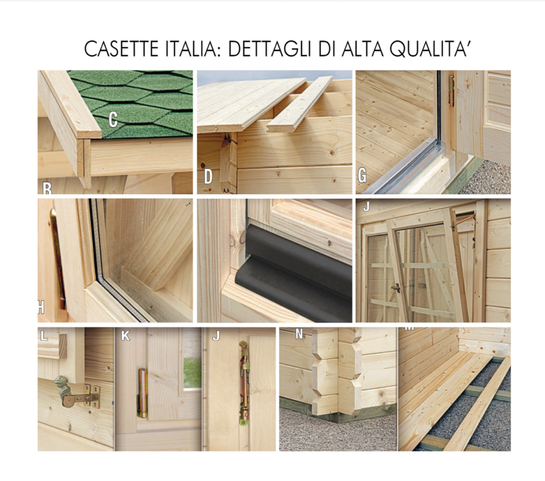 Rinforzi anti-tempesta: Tutte le casette hanno rinforzi anti-tempesta in legno oppure barre filettate invisibili all’interno delle pareti. Essi consolidano la struttura contro tempeste e sisma.