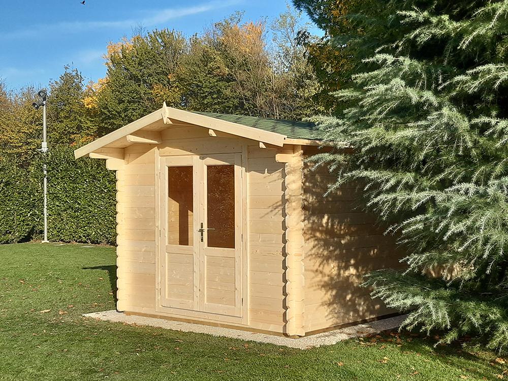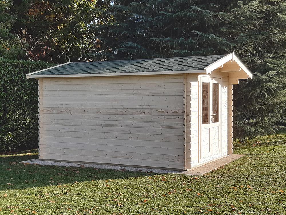 Casetta in legno massello di abete nordico, con elevata resistenza al carico neve grazie allo spessore delle pareti. Il suo design versatile a la solidità intrinseca ne consentono gli utilizzi più svariati. La casetta è dotata di doppia porta con vetri sulla metà superiore, una soglia di  alluminio che permette la lunga durata della porta stessa, dotata anche di guarnizione isolante per assicurarne l’efficienza energetica. Le maniglie sono resistenti e le serrature sono a cilindro (tipo Yale).