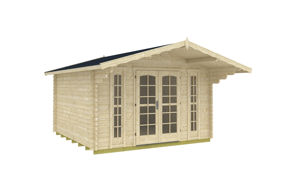 Casetta in legno di dimensioni abitabili in abete bianco nordico massiccio di elevato spessore: 40mm; ovvero progettata in blockhouse-system che ne garantisce robustezza e durata nel tempo. La casetta è dotata di ampi spazi finestrati, infatti sia la doppia porta di ingresso che le 2 finestre frontali sono a "tutto-vetro" e permettono la massima illuminazione interna con luce naturale. Per tale ragione la casetta si presta ottimamente ad essere vissuta in compagnia di amici e parenti per momenti di gioco e relax in giardino, sia nelle giornate di sole che di pioggia. Sono utilizzati legni della migliore qualità e rigorosamente provenienti dal nord-Europa.