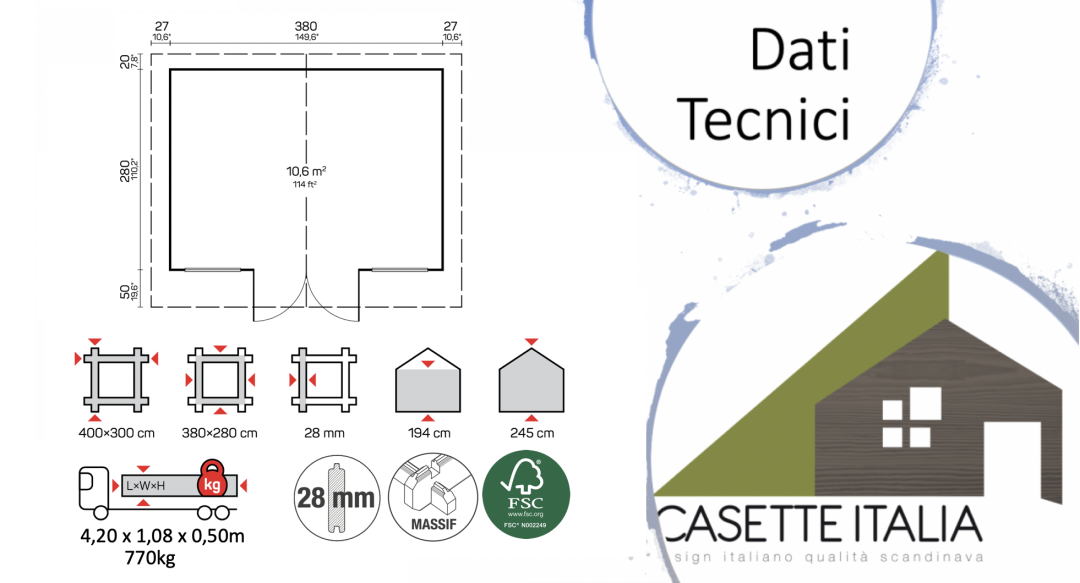 Casetta in legno  abitabile a vano unico e dalla architettura classica. La casetta prefabbricata è dotata di porta semi-finestrata e di 2 finestre frontali che affiancano la doppia porta semi-finistrata: la luce naturale all'interno è garantita! La tettoia frontale sborda per circa 50cm ed il tetto, grazie alla abbondante inclinazione permette un ottimo defluire dell'acqua piovana e della neve e possono anche essere inserite le gronde ed i pluviali a completamente della casetta. Legno massello di abete nordico e proveniente da foreste certificate FSC (alberi a lenta crescita che garantiscono la minima presenza di nodi da ramo sulle assi, quindi la massima robustezza ed estetica nel tempo).  La casetta in legno è dotata di porta con vetri, serrature moderne e resistenti a cilindro (tipo serratura Yale).
