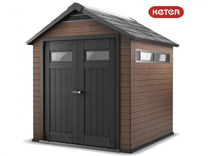 Casette da giardino in plastica e legno Keter (il materiale tecnicamente è chiamato WPC). È una casetta che unisce robustezza ed eleganza estrema grazie alla particolare estetica delle pareti esterne simil-legno. È ideale per immagazzinare per tutto il periodo autunnale ed invernale i vari attrezzi ed oggetti del giardino. Il particolare materiale costruttivo legno-plastica è un materiale composito che ha l’aspetto del legno senza necessitare delle cure e della manutenzione del legno. Inoltre, tutta la casetta risulta altamente eco-compatibile in quanto per la realizzazione del composito viene utilizzato legno riciclato e polipropilene biocompatibile.