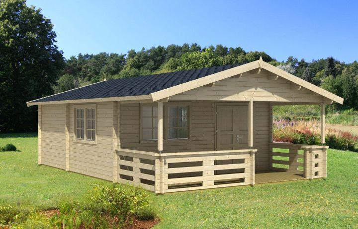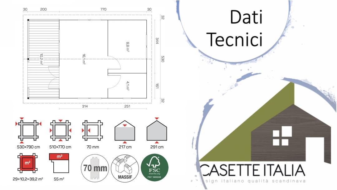 Chalet in legno ad elevato spessore di 70mm ed alto isolamento termico, in legno massello in abete nordico naturale con 3 ampi vani interni: un open-space finalizzato a dining/living-room con possibilità di adibire una parete ad angolo cucina , un bagno ed una camere da letto. Frontalmente lo chalet è posizionata una splendida terrazza-loggiata di 10mq e completamente coperta e protetta da parapetto perimetrale che permette di vivere questo spazio aperto in tutte le stagioni ed organizzare pranzi e cene in compagnia e all'aria aperta. Le pareti sono costruite con sistema BLOCKHOUSE in legno massello (questo modello è disponibile anche con pareti minime di 58mm) ed i serramenti sono robusti ed isolanti per un utilizzo in tutte le stagioni. Infatti, lo chalet garantisce  una ottimo isolamento termico anche nella stagione invernale, in quanto permette un riscaldamento veloce ed uniforme con un alto comfort climatico interno. All'interno degli ampi e luminosi vani (5 finestre totali di cui 4 doppie con apertura sia battente che basculante ed una di servizio) è possibile installare a piacimento gli eventuali impianti elettrici, idraulici, scarico cucina, ecc. Pavimento composto da assi massicce di abete nordico da 18mm.