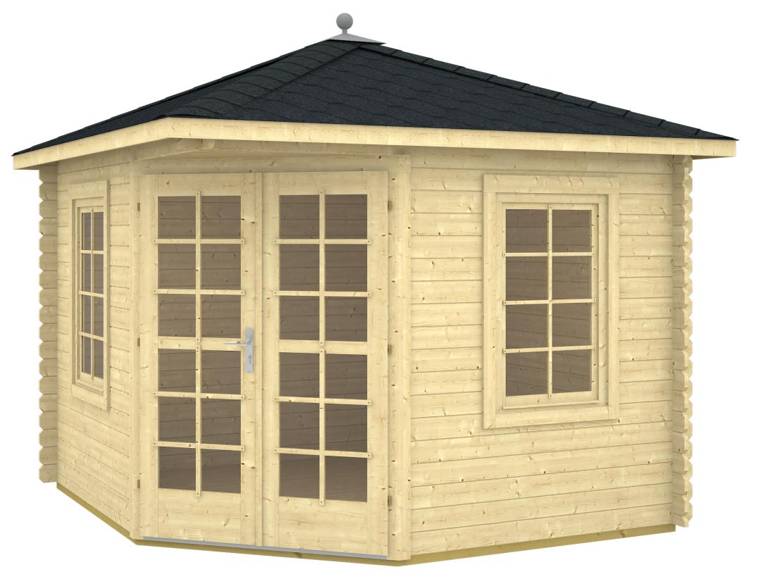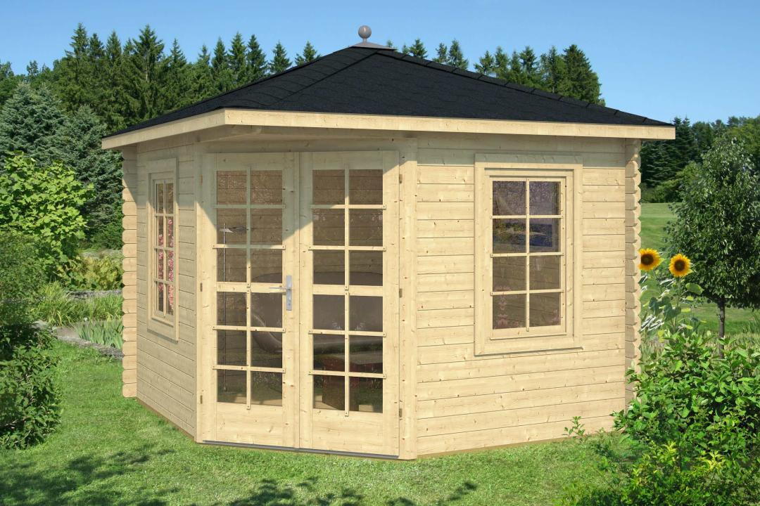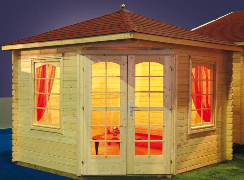 Il gazebo in legno ha una forma pentagonale asimmetrica con struttura autoportante a padiglione coperto e con 3 lati finestrati: due finestre (0,87x1,21m) e una porta finestrata (1,43x1,9m). Il gazebo in legno oggi è un arredo da esterni molto di moda in quanto permette di sfruttare al meglio gli spazi del giardino sia durante l’estate che nelle stagioni intermedie. Infatti le ampie vetrate e le buone qualità isolanti dei vetri consentono una ottima illuminazione interna ma anche un elevato isolamento termico.